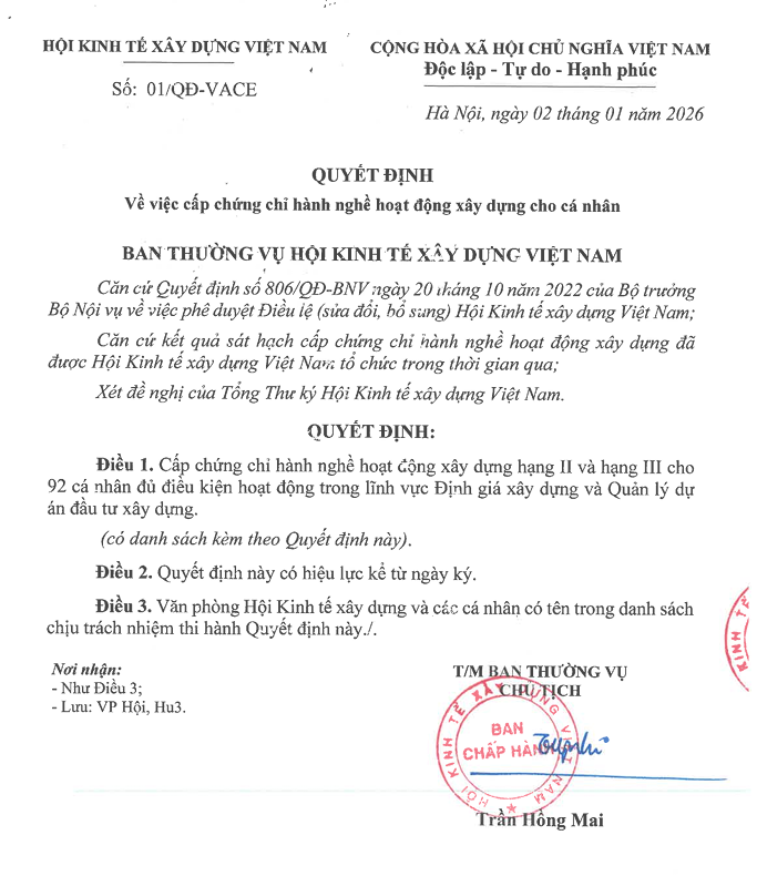 Căn cứ kết quả kiểm xét hồ sơ năng lực và kết quả sát hạch chứng chỉ của hội viên, Hội đồng xét cấp chứng chỉ hành nghề hoạt động xây dựng của Hội Kinh tế Xây dựng Việt Nam, Cục Quản lý hoạt động xây dựng cấp mã số chứng chỉ hành nghề xây dựng cho 92 cá nhân có kết quả đạt yêu cầu như sau: