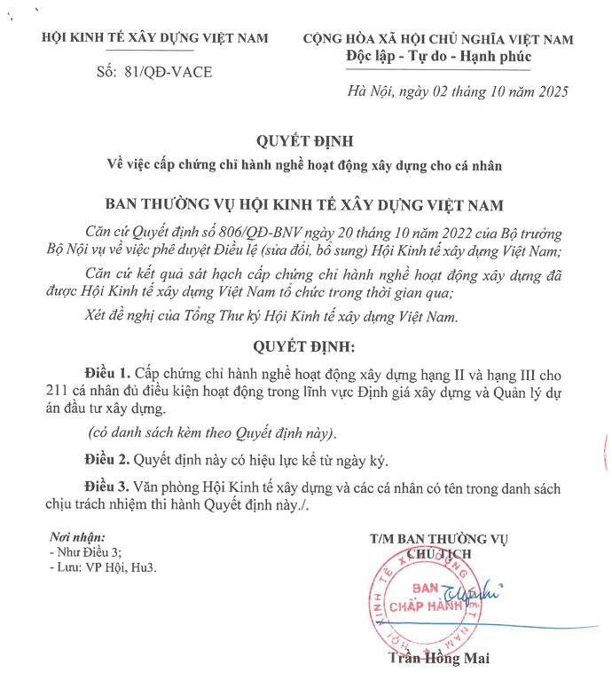 Căn cứ kết quả kiểm xét hồ sơ năng lực và kết quả sát hạch chứng chỉ của hội viên, Hội đồng xét cấp chứng chỉ hành nghề hoạt động xây dựng của Hội Kinh tế Xây dựng Việt Nam, Cục Quản lý hoạt động xây dựng cấp mã số chứng chỉ hành nghề xây dựng cho 211 cá nhân có kết quả đạt yêu cầu như sau: