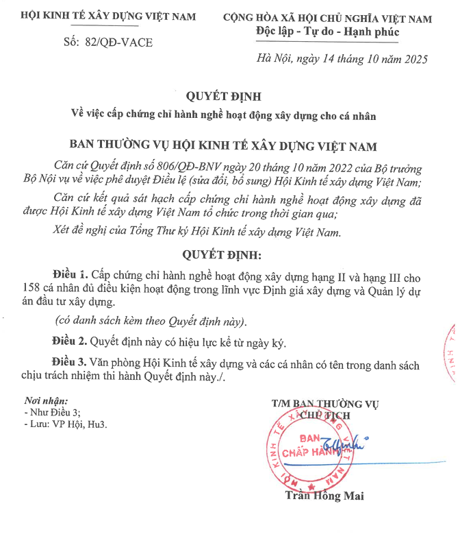 Căn cứ kết quả kiểm xét hồ sơ năng lực và kết quả sát hạch chứng chỉ của hội viên, Hội đồng xét cấp chứng chỉ hành nghề hoạt động xây dựng của Hội Kinh tế Xây dựng Việt Nam, Cục Quản lý hoạt động xây dựng cấp mã số chứng chỉ hành nghề xây dựng cho 158 cá nhân có kết quả đạt yêu cầu như sau: