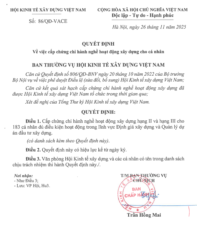 Căn cứ kết quả kiểm xét hồ sơ năng lực và kết quả sát hạch chứng chỉ của hội viên, Hội đồng xét cấp chứng chỉ hành nghề hoạt động xây dựng của Hội Kinh tế Xây dựng Việt Nam, Cục Quản lý hoạt động xây dựng cấp mã số chứng chỉ hành nghề xây dựng cho 183 cá nhân có kết quả đạt yêu cầu như sau: