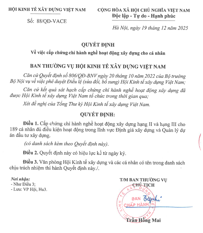 Căn cứ kết quả kiểm xét hồ sơ năng lực và kết quả sát hạch chứng chỉ của hội viên, Hội đồng xét cấp chứng chỉ hành nghề hoạt động xây dựng của Hội Kinh tế Xây dựng Việt Nam, Cục Quản lý hoạt động xây dựng cấp mã số chứng chỉ hành nghề xây dựng cho 189 cá nhân có kết quả đạt yêu cầu như sau: