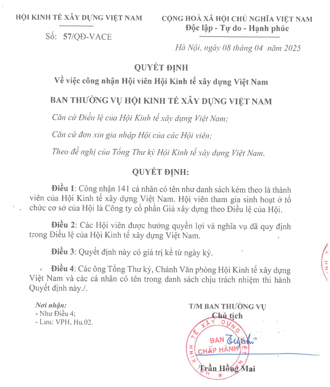 Căn cứ đơn xin gia nhập Hội của các Hội viên, Theo đề nghị của Ban Thường vụ Hội kinh tế xây dựng Việt Nam công nhận các cá nhân có tên trong danh sách kèm theo là thành viên Hội Kinh tế xây dựng Việt Nam, Hội viên tham gia sinh hoạt ở tổ chức, cở sở là Công ty Cổ phần Giá Xây Dựng theo điều lệ của Hội.