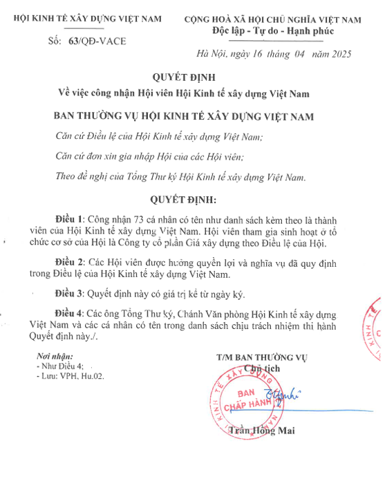 Căn cứ đơn xin gia nhập Hội của các Hội viên, Theo đề nghị của Ban Thường vụ Hội kinh tế xây dựng Việt Nam công nhận các cá nhân có tên trong danh sách kèm theo là thành viên Hội Kinh tế xây dựng Việt Nam, Hội viên tham gia sinh hoạt ở tổ chức, cở sở là Công ty Cổ phần Giá Xây Dựng theo điều lệ của Hội.